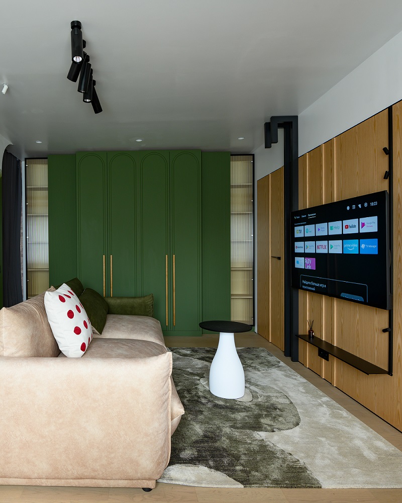 Весь интерьер получился очень гармоничным, и по цветовой гамме, и по расстановке мебели. Не обошлось и без лёгкого хулиганства дизайнера в виде частично закрашенных картин.