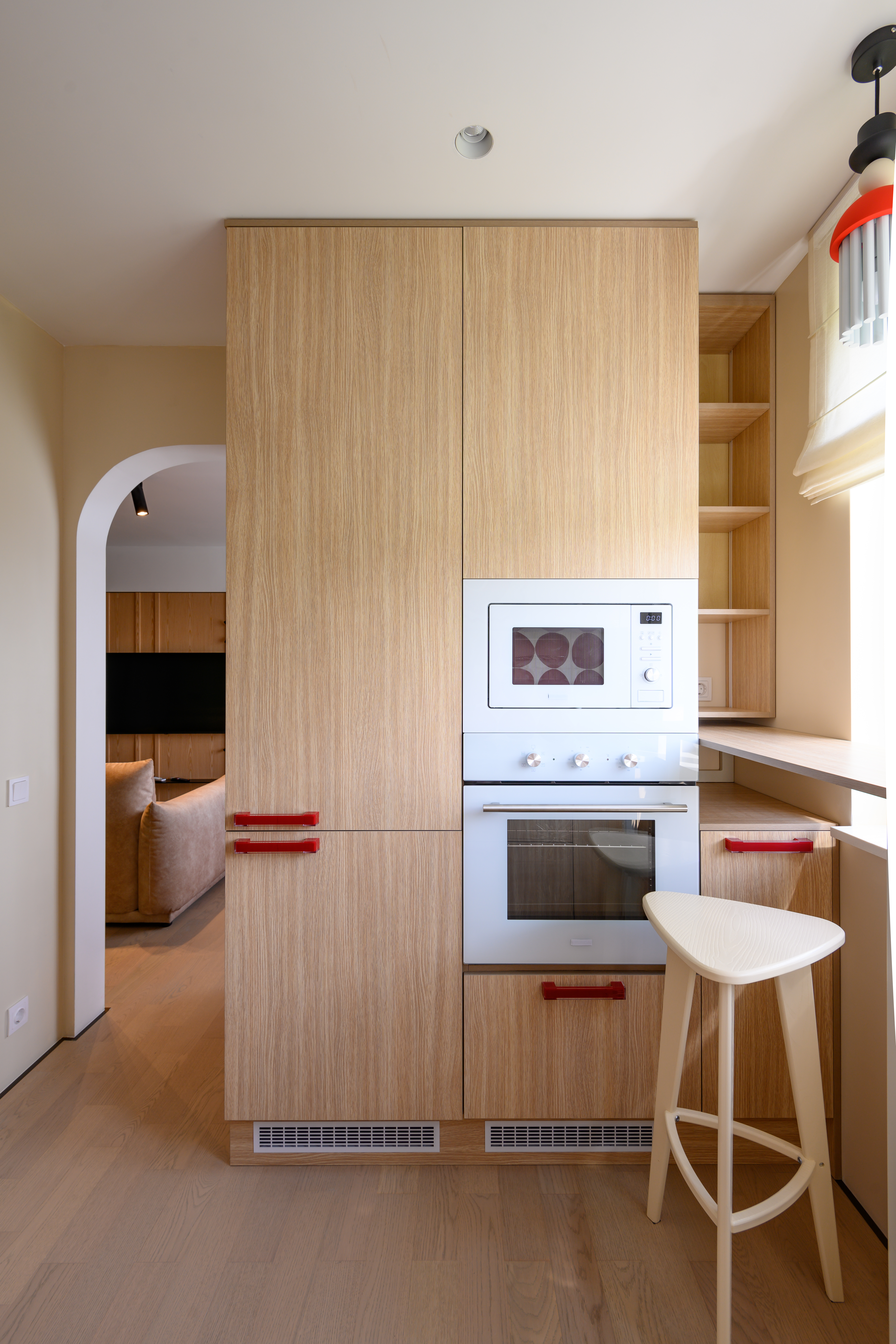 Люстра в абажуре из кистей для рисования в обеденной зоне — одна из фишек проекта.