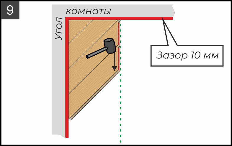 9.5. Продолжайте монтаж плашек, соединяя замки под углом. Двигайтесь так до стены. Тщательно проверяйте стыки между плашками на отсутствие зазоров после добавления каждой следующей. При необходимости подбивайте плашки при помощи киянки и подбойника (рис. 8-9).